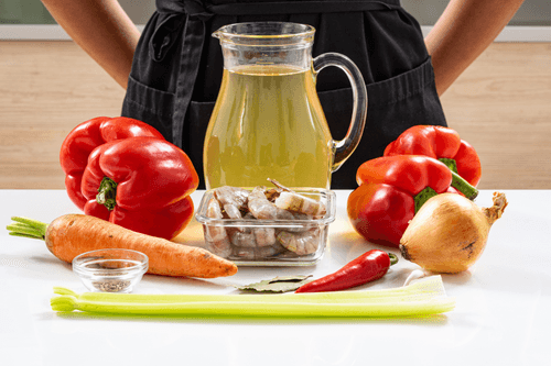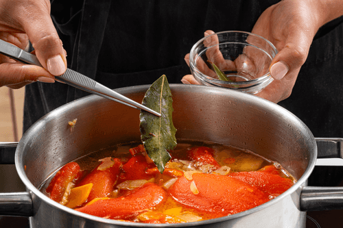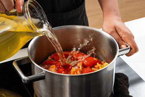 Налить в кастрюлю разогретый бульон или просто кипяток так, чтобы жидкость покрывала овощи примерно на 1,5–2 см.