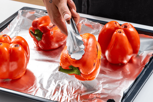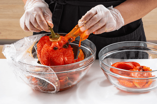 Вынуть противень из духовки, затянуть фольгой и дать перцу в таком виде остыть. Потом очистить перец от плодоножки, кожи и семян.