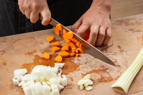 Лук, морковь, сельдерей и чеснок нарезать произвольно.