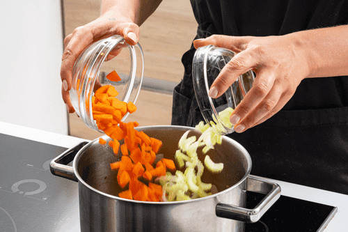 Добавить морковь и сельдерей, обжаривать, помешивая, еще 3 минуты.