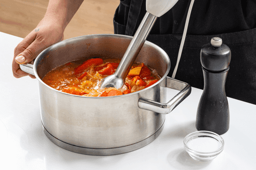 Измельчить суп блендером в гладкое пюре. Посолить и поперчить по вкусу. Остудить и убрать в холодильник.