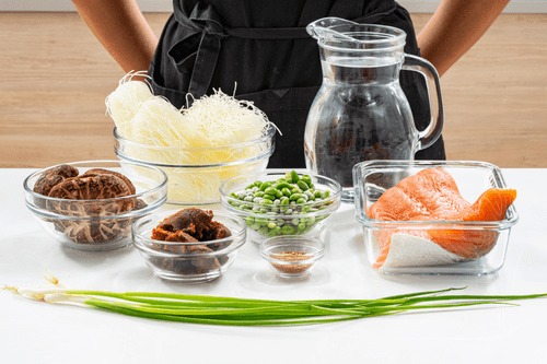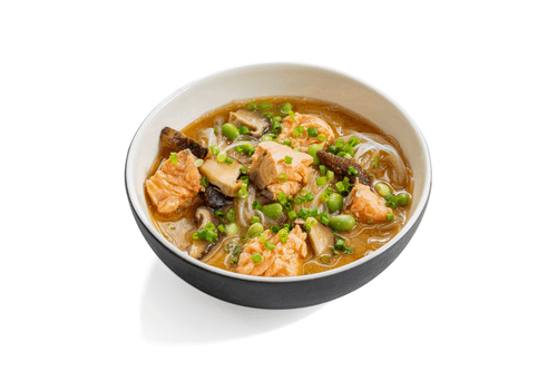 Холодный мисо-суп с лососем, шиитаке и бобами эдамамэ