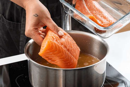 Выложить в кастрюлю лосося и дать в таком виде остыть.