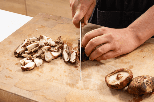 Шиитаке нарезать тонкими пластинками.