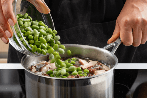 Грибы и бобы эдамамэ сварить в отдельном сотейнике в течение 3 минут. Добавить их к бульону и убрать в холодильник.