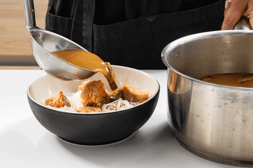 Развести мисо-пасту в небольшом количестве получившегося бульона и вылить в кастрюлю.