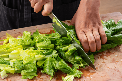 Тем временем заняться супом. Салат романо нарезать на небольшие куски.