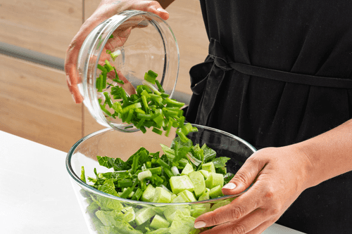 Смешать салат, нарезанные огурцы, шпинат и 3 стебля зеленого лука.