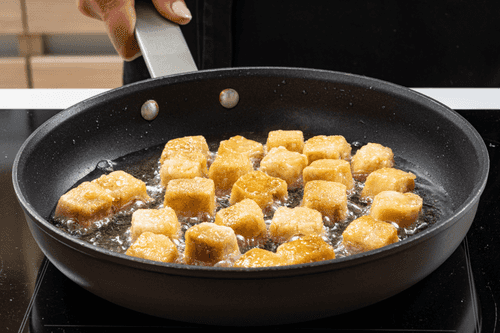 С тофу слить маринад, присыпать кубики крахмалом и обжарить во фритюре до золотистой корочки.
