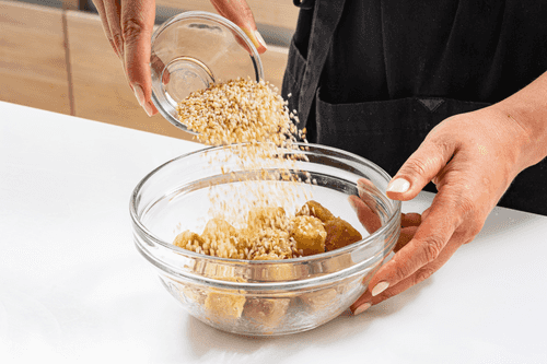 Обжаренный тофу обвалять в кунжуте.