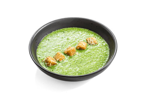 Прообразом этого рецепта выступил болгарский таратор — то ли напиток, то ли суп из тертых огурцов. В жару эту огуречную жижу заправляют кислым молоком и смешивают со льдом. Мы слегка добавили супу плотности и усилили изумрудный оттенок, присовокупив к огурцам свежий шпинат. А для сытности кинули в тарелку кубики обжаренного тофу: белок нашему организму необходим в любую погоду, но в летнее пекло соевый творог воспринимается легче, чем мясо. Если заправить суп не обычным, а соевым йогуртом, рецепт станет веганским.