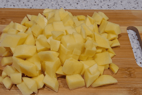 Картофель очистить от кожуры, хорошо вымыть, нарезать кубиками.