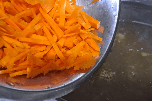 Морковь очистить, хорошо вымыть, нарезать соломкой, выложить в бульон. Варить примерно 30 минут до готовности картофеля и моркови.
