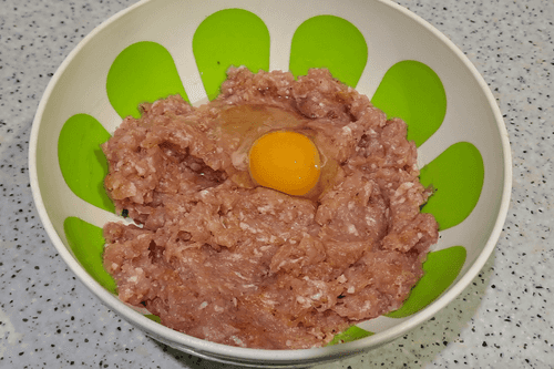 Добавить в фарш 1 куриное яйцо. Фарш повторно перемешать и немного отбить.
