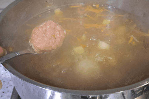 С помощью чайной ложки мокрыми руками сформировать фрикадельки и выложить в бульон с готовым картофелем. Варить примерно 5–10 минут до готовности фрикаделек.