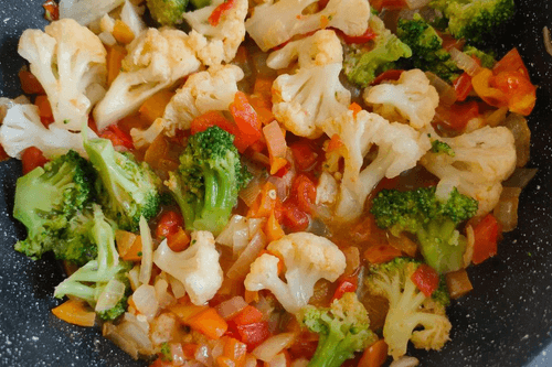 Капусту разобрать или разрезать на небольшие соцветия и добавить к овощам в сковороду.