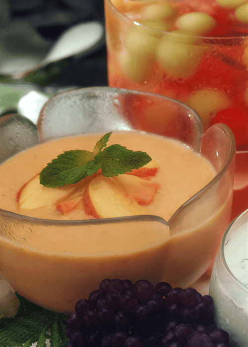 Холодный сладкий суп с нектаринами — это нежное и освежающее блюдо, которое является воплощением летней лёгкости. Он напоминает о старинных русских традициях использования фруктов в охлаждённых десертах, когда свежесть была особой ценностью в жаркие дни. Вкус этого супа богатый и многогранный: сладость спелых нектаринов гармонично сочетается с кислинкой лимона и виноградного сока, а тонкая нотка корицы придаёт ему пикантность. Лёгкость приготовления делает его идеальным выбором для быстрого летнего угощения, а мята добавляет изысканную свежесть. Этот суп можно подавать как десерт или лёгкое освежающее блюдо, которое украсит любой стол. Он отлично сочетается с хрустящим печеньем или охлаждённым белым вином, создавая атмосферу истинного гастрономического наслаждения.