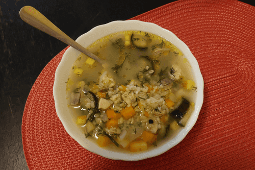 По завершении варки разлить суп по тарелкам и добавить растительное масло.