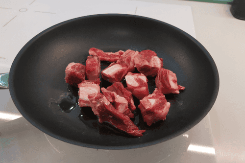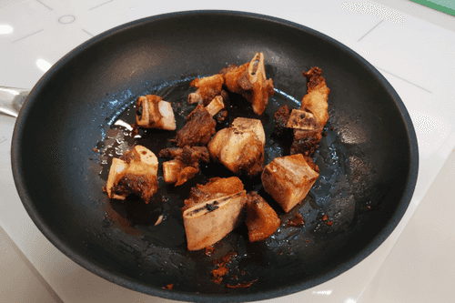 Выложить говяжьи кости в разогретое на сковороде оливковое масло.