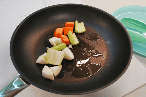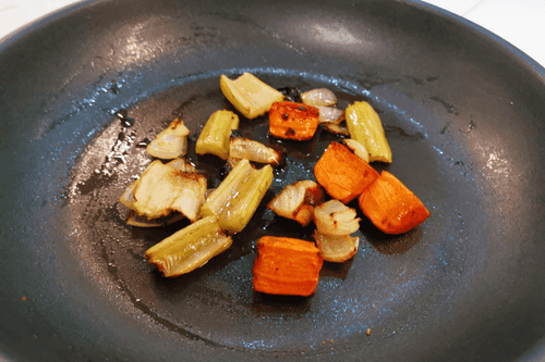 Крупно нарезать овощи и выложить на сковороду, на которой обжаривались кости.