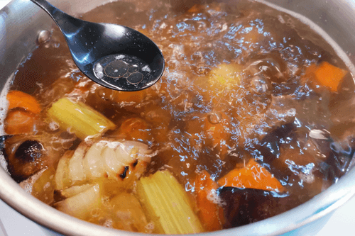 Выложить кости и овощи в кастрюлю, залить водой и поставить на сильный огонь.