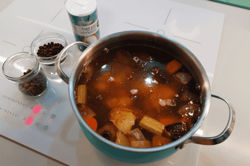 Довести до кипения и убавить огонь до среднего. Посолить и добавить перцы горошком. Варить минимум 30 минут.