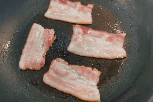 Выложить бекон на разогретую сковороду. Обжаривать на сильном огне с каждой стороны по 1–2 минуты.