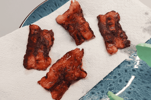 Выложить бекон на салфетки, чтобы избавиться от лишнего жира.