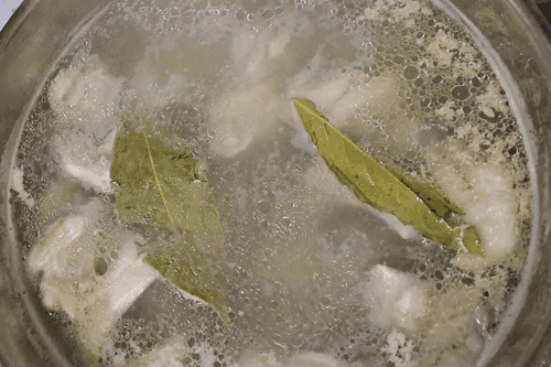 Выложить в кастрюлю 2 лавровых листа, посолить по вкусу, варить примерно 30 минут под закрытой крышкой на среднем или слабом огне.