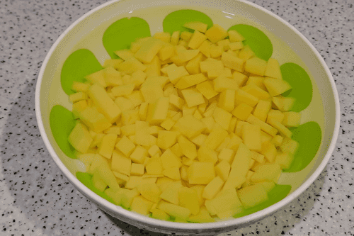 Картофель очистить от кожуры, хорошо вымыть под проточной водой, нарезать кубиками.