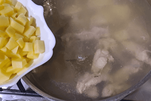 Выложить картофель в кастрюлю с мясом, довести до кипения, при необходимости снять пену, варить с открытой крышкой на среднем огне.