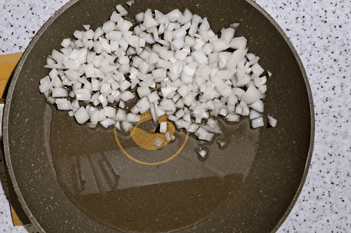 Лук очистить, хорошо вымыть под проточной водой, нарезать мелкими кубиками и выложить на сковороду с растительным маслом.
