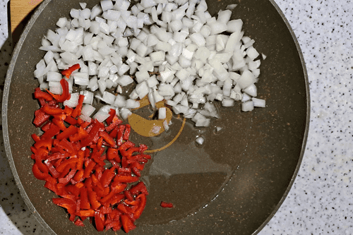 Красный болгарский перец очистить от семян и плодоножки, нарезать мелко соломкой и выложить в сковороду к луку.