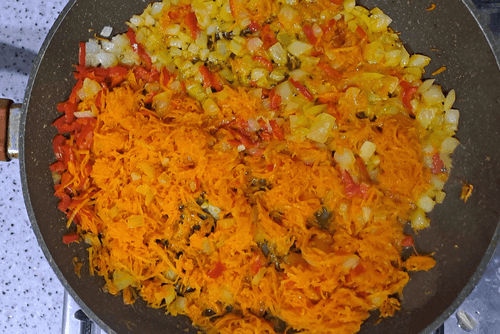 Морковь очистить, хорошо вымыть под проточной водой, натереть на мелкой терке и выложить в сковороду.