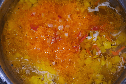 Когда картофель будет готов, выложить со сковороды в кастрюлю готовые овощи и макароны.