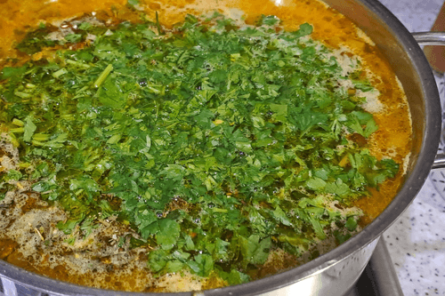 Петрушку хорошо вымыть под проточной водой, убрать все лишнее, мелко нарезать и выложить в кастрюлю. Довести до кипения, при необходимости снять пену и посолить по вкусу. Варить суп еще примерно 5–7 минут с открытой крышкой.