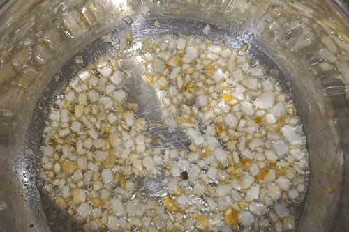 В кастрюлю с толстым дном влить 50 мл растительного масла. Лук очистить, нарезать мелкими кубиками, выложить в кастрюлю, поставить на огонь, жарить до золотистого цвета.