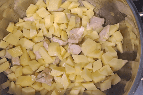Картофель очистить, хорошо вымыть, нарезать небольшими кубиками, выложить в кастрюлю к мясу.