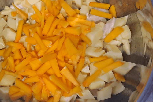 Тыкву очистить вымыть, нарезать мелкой соломкой, выложить в кастрюлю к мясу и картофелю.