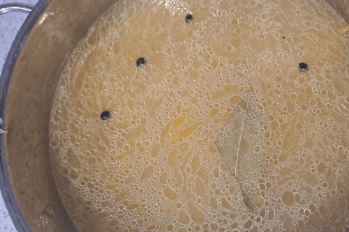 Выложить в кастрюлю лавровый лист и 5 горошин душистого перца, посолить по вкусу.