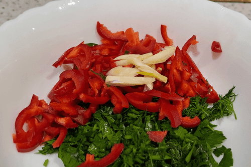 Укроп и петрушку вымыть, убрать все лишнее, мелко нарезать, выложить в емкость. Сладкий перец очистить от семян, вымыть и нарезать мелкой соломкой. Чеснок очистить вымыть, нарезать соломкой или вдавить через пресс, выложить в емкость к нарезанной зелени и перцу.