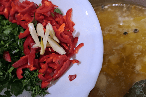 Когда картофель приготовиться выложить в кастрюлю подготовленную зелень, перец и чеснок. Довести до кипения, варить примерно 10 минут.