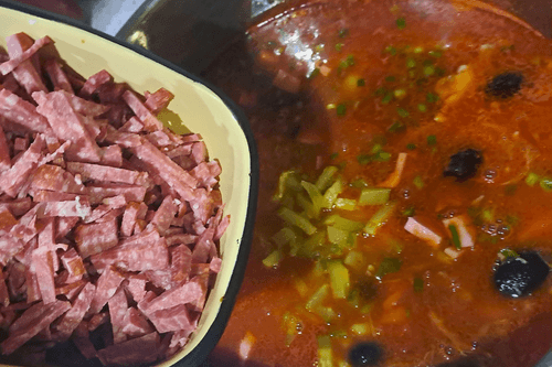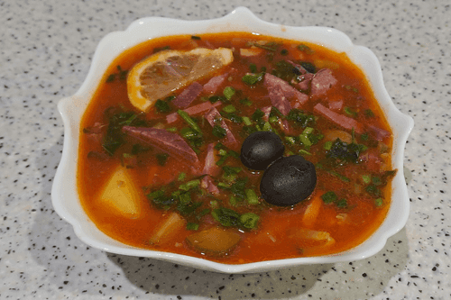 Солянка с колбасой — это ароматное, густое и насыщенное блюдо, которое олицетворяет богатство русской кухни. В ее основе — мясной бульон, копченая колбаса, овощи и пряности, создающие сложный и многогранный вкус. История солянки восходит к старинным трактирным традициям, когда она служила питательной, согревающей пищей для путешественников. Отличительная черта солянки — кисло-пряная нота, достигаемая за счет сочетания маринованных огурцов, лимона и томатной пасты. Готовое блюдо радует глаз золотистыми красками, нежным ароматом копченостей и бодрящей свежестью лимона. Солянку подают горячей, сопровождая свежей зеленью, сметаной и ломтем ржаного хлеба — идеальный выбор для уютного семейного ужина или праздничного застолья.