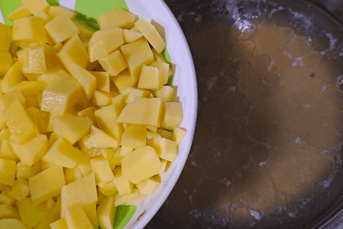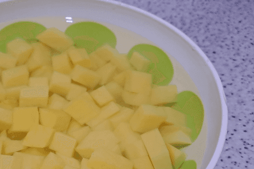 Картофель очистить, нарезать кубиками или соломкой, залить водой отставить в сторону.