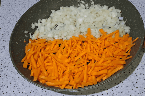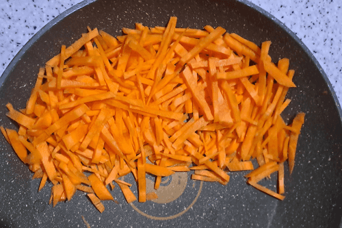 Морковь очистить, хорошо вымыть, нарезать соломкой или мелкими кубиками и выложить в сковороду.