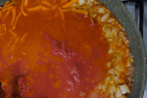 Жарить лук и морковь до золотистого цвета. Добавить в сковороду 300 грамм томатной пасты, немного обжарить (5 минут) помешивая, добавить 1–2 половника бульона и протушить еще 5 минут.