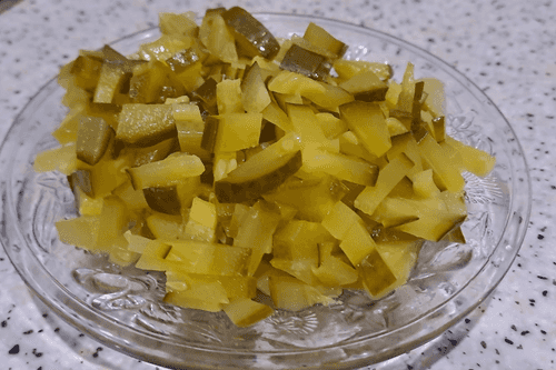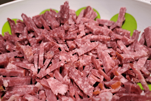 Копченую колбасу нарезать соломкой или мелкими кубиками.