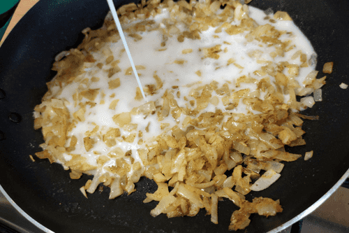 Влить кокосовое молоко. Тушить 5–7 минут.