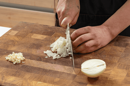 Нарезать репчатый лук мелкими кубиками, чеснок мелко порубить.
