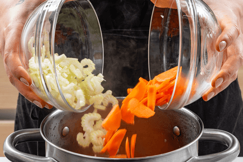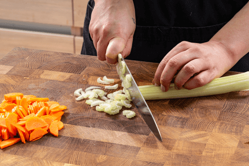 Сельдерей нарезать ломтиками, морковь — полукольцами.